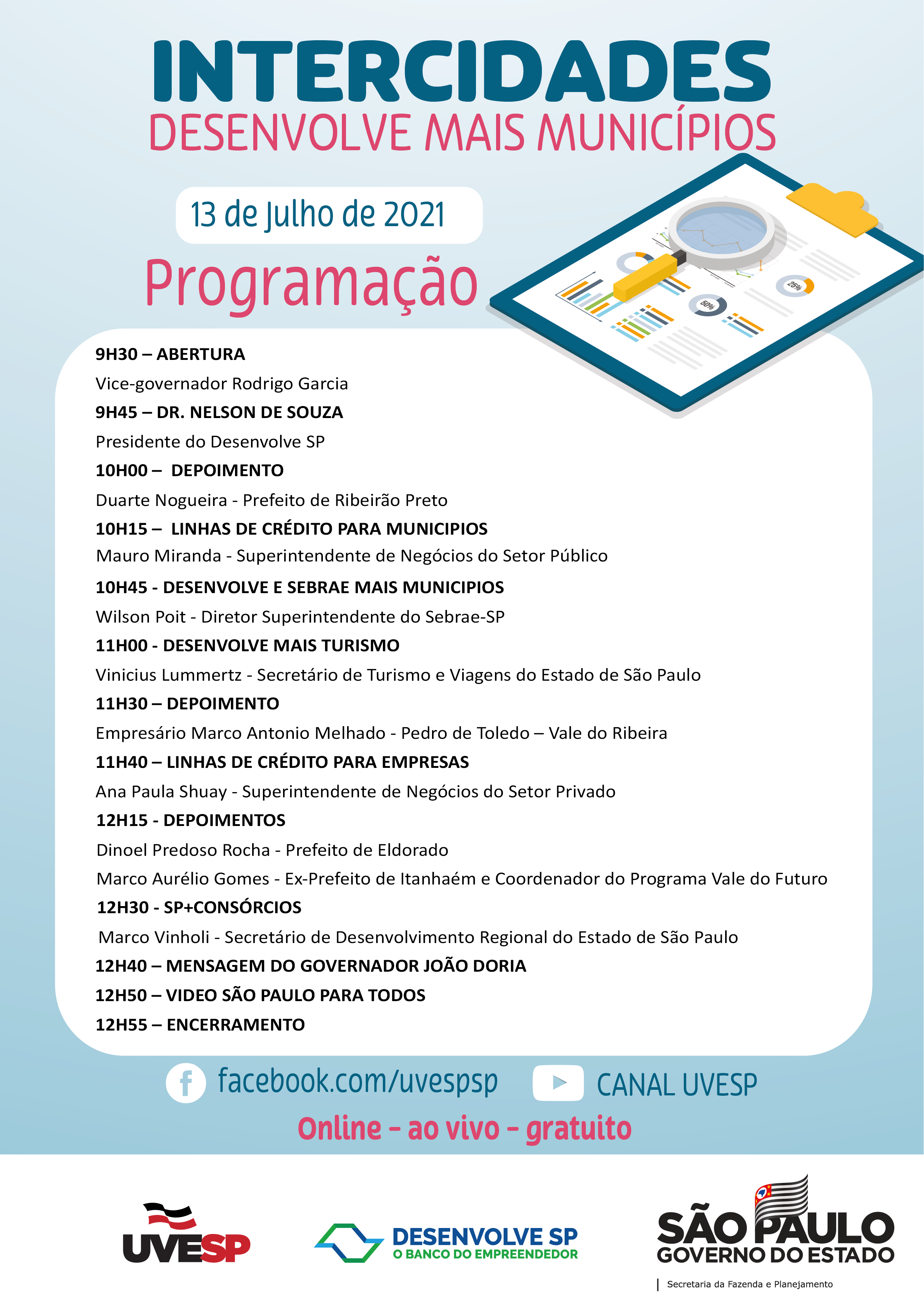 Empresas e Municípios poderão conhecer esses caminhos participando do Intercidades, das 9h30 às 13h00, pelos canais nas redes sociais da Uvesp.